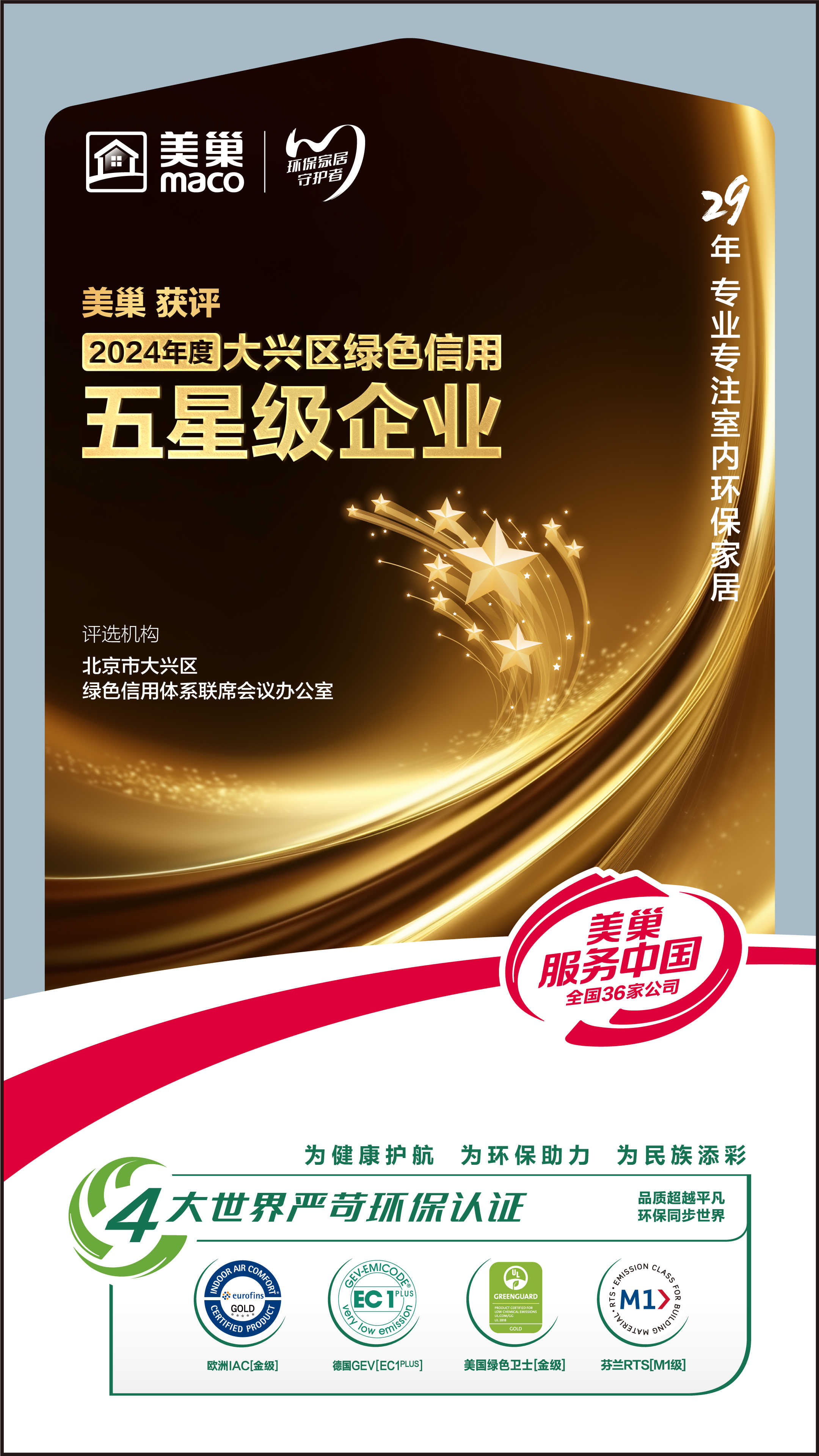 近日,在北京市大興區(qū)與河北省廊坊市聯(lián)合舉辦的“美麗中國(guó)我先行——興廊攜手走進(jìn)美麗空港”六五環(huán)境日主場(chǎng)活動(dòng)中,美巢憑借在環(huán)境守法、治污減排、低碳循環(huán)、科學(xué)管理和社會(huì)貢獻(xiàn)等5個(gè)維度的卓越表現(xiàn),被評(píng)為2024年度“綠色信用五星級(jí)企業(yè)”。