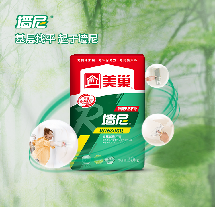 墻尼QN680GQ高強粉刷石膏是一種粗砂型室內墻面底層抹灰材料。臻選原料,嚴苛工藝,既具有快硬、早強、防火等特點,又具有和易性好、易涂抹、施工速度快、粘結強度高、不空鼓、不開裂等特點,適用于混凝土、加氣混凝土、磚混砂漿墻面和頂棚的厚層抹灰找平。